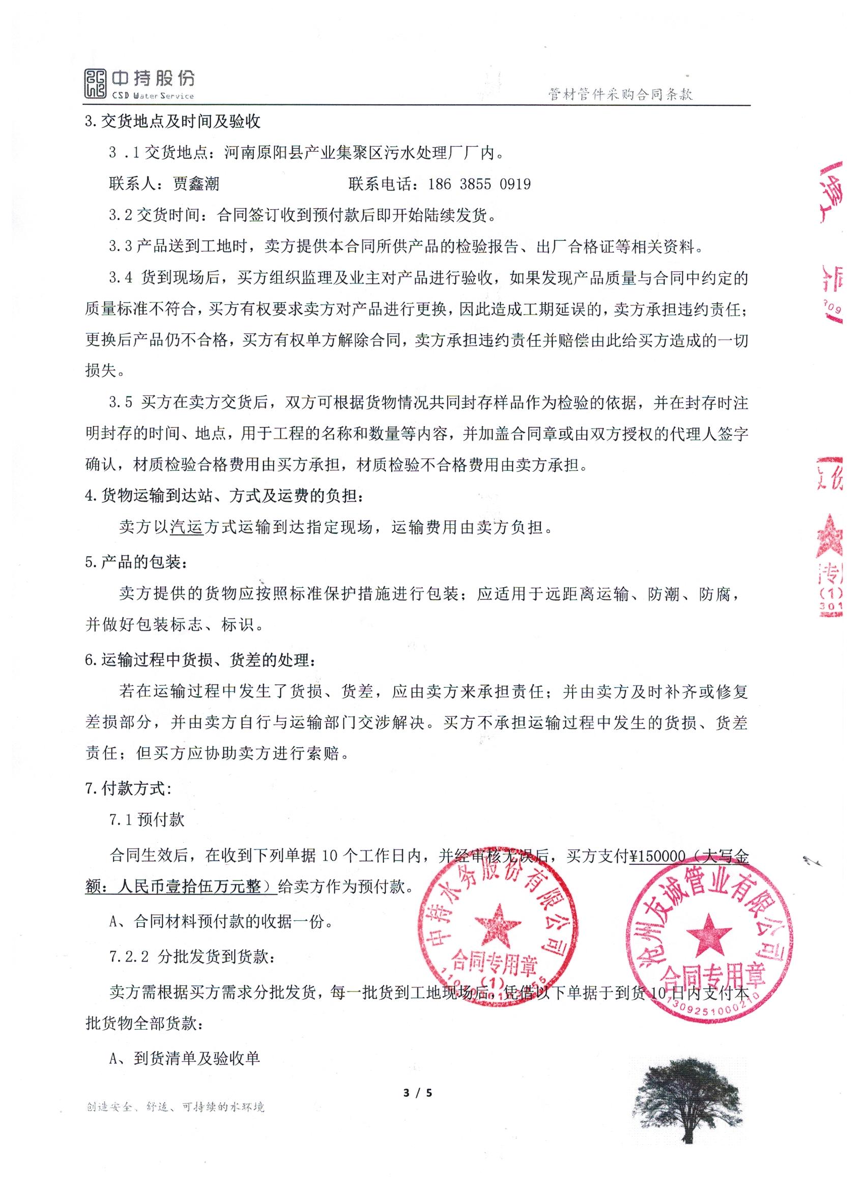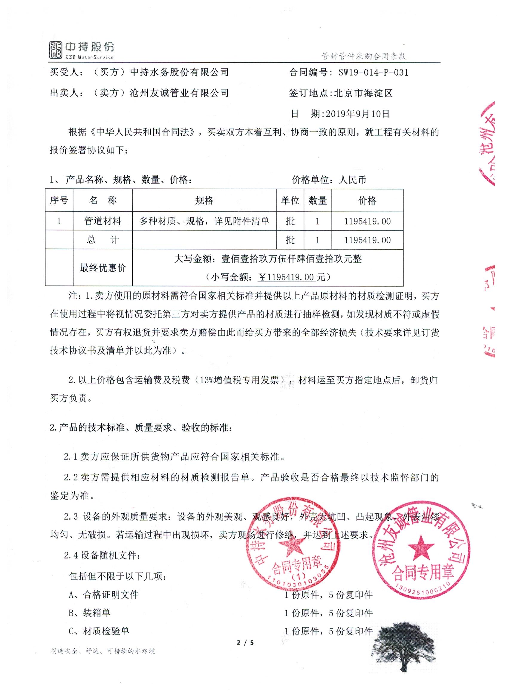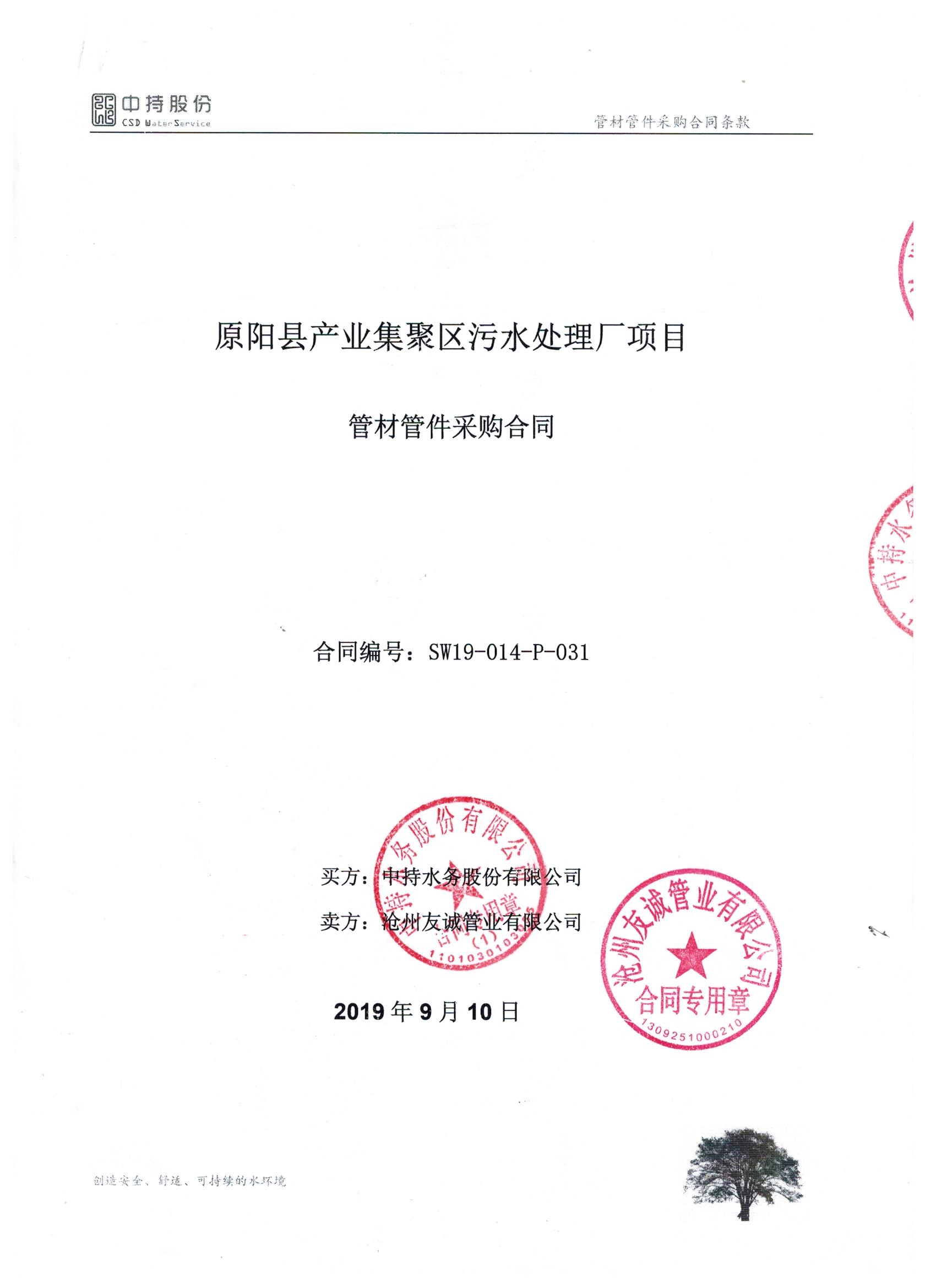2019年9月份,友誠管業(yè)與中持水務(wù)股份有限公司(上市公司),簽訂了原陽縣污水處理廠項目的防腐螺旋鋼管合同,非常感謝貴公司對我們的信任,我們也一如即讓的做好每一支鋼管